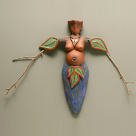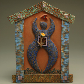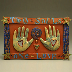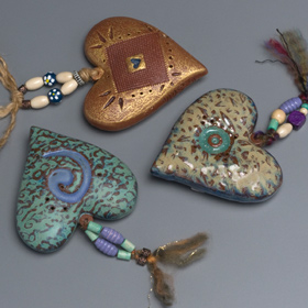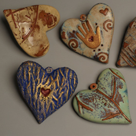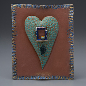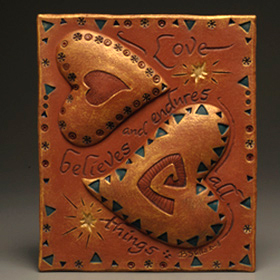 Bernadette’s wall pieces combine her talents as a 2-D and 3-D artist. Even though these pieces are in a series, each one is made individually, and she incorporates the frame and colors into the piece as it is formed. Her latest wall hearts also incorporate calligraphy of her favorite love poems, carved right into the clay. The lettering is highlighted with gold-flecked paint. Price Range: $24.00-$150.00
