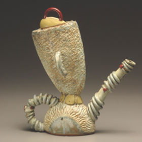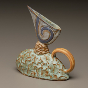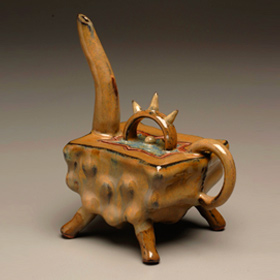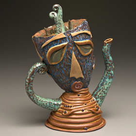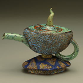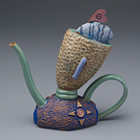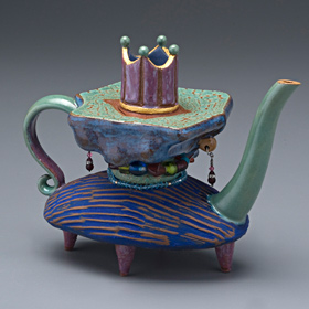 Teapots are a wonderful challenge to the ceramic artist: to make all 4 parts meld together into one unified piece, being both functional, and pleasing to the eye. In Bernadette’s teapots, her goal is to also imbue a sense of whimsy and character, so that each one has its own unique story, and is truly one-of-a-kind. Painting the glaze is well thought out, and an intricate part of the finishing process.