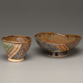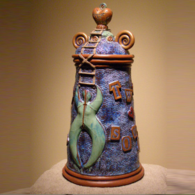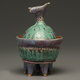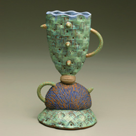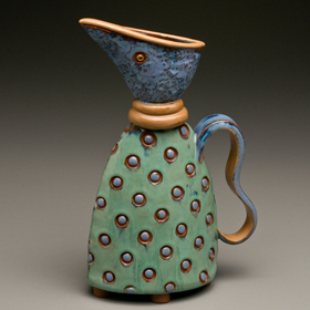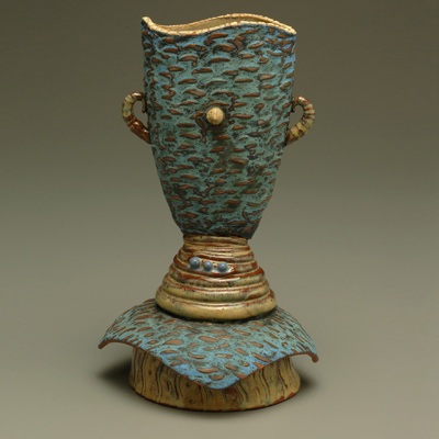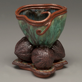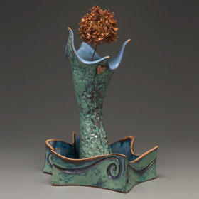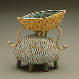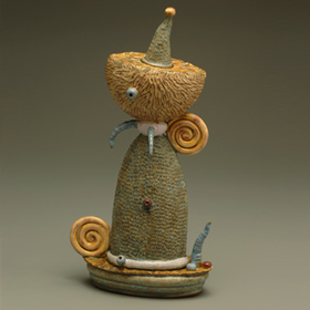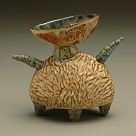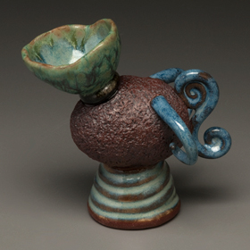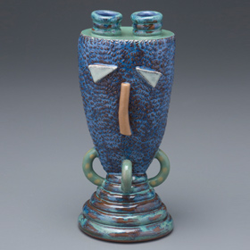 Each vase or vessel starts out as a series of shapes that Bernadette constructs, layering form on top of form, "until a piece is born that speaks to me." Some were inspired by stories she read to her daughter at bedtime or are imaginary characters created at whim. They are a very figurative based, and can be either very primitive, or very funny! Each piece is unique, and is hand built either out of terracotta or stoneware clay. Painting the glaze is well thought out, and an intricate part of the finishing process. Each vase is one-of-a-kind yet functional, and putting flowers in them just adds to their character Price range: